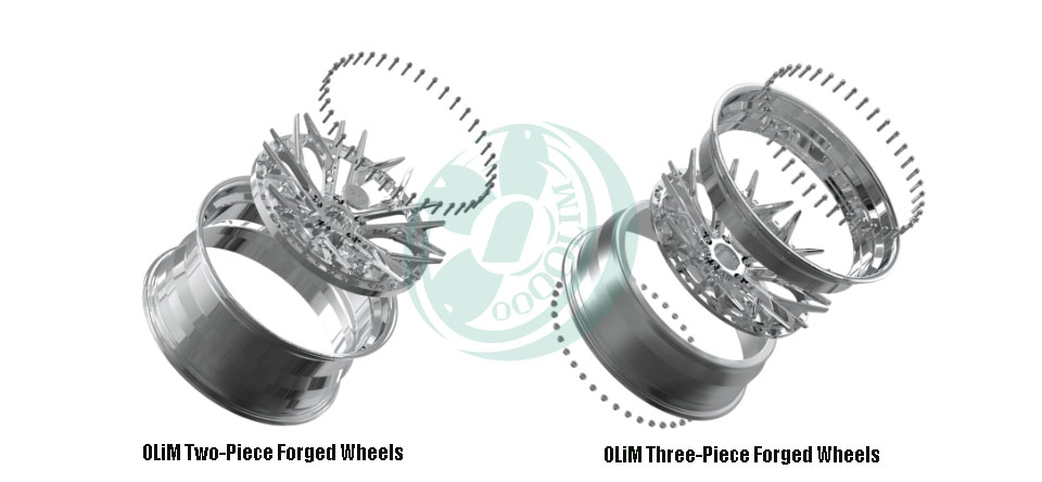 OLiM 3-delt smedede hjul er mesterværker af tilpasset kunstnerskab. Den midterste skive, den indvendige cylinder og den ydre læbe er separate komponenter, omhyggeligt samlet med bolte i rumfartskvalitet og proprietære tætningsløsninger. Hver del kan tilpasses uafhængigt.